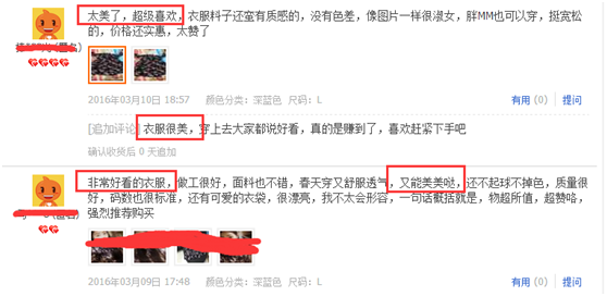 大家看到沒,漂亮、版型好、穿著美、版型漂亮……,對款式的重視程度是很高的。在看看下面的語言風格!